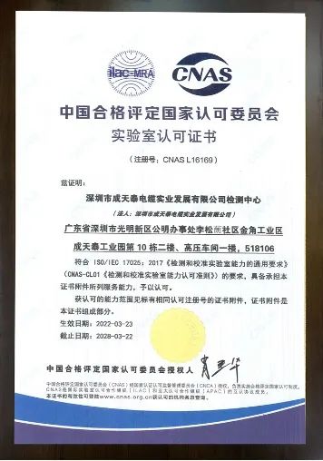凭借先进的研发设备以及经验丰富的研发人才,成天泰获得了CNAS国家级实验室认证,CNAS是目前国内唯一有资格颁发国家认可实验室的机构,该项认可审核时间最长,通过难度最大,是国际互认的权威认证机构,产品质量方面,也通过了ISO900、ISO4001等多项质量认证。凭借不断创新的那股劲,成天泰成为深圳电线电缆行业的典范,并将创新型产品应用到了不同的城市项目当中。